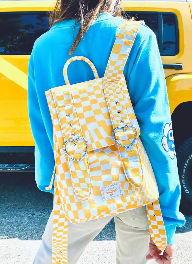 This yellow checkered backpack features heart buckles, magnetic closures, adjustable straps, a drawstring, canvas lined interior, and zipper pouch inside.