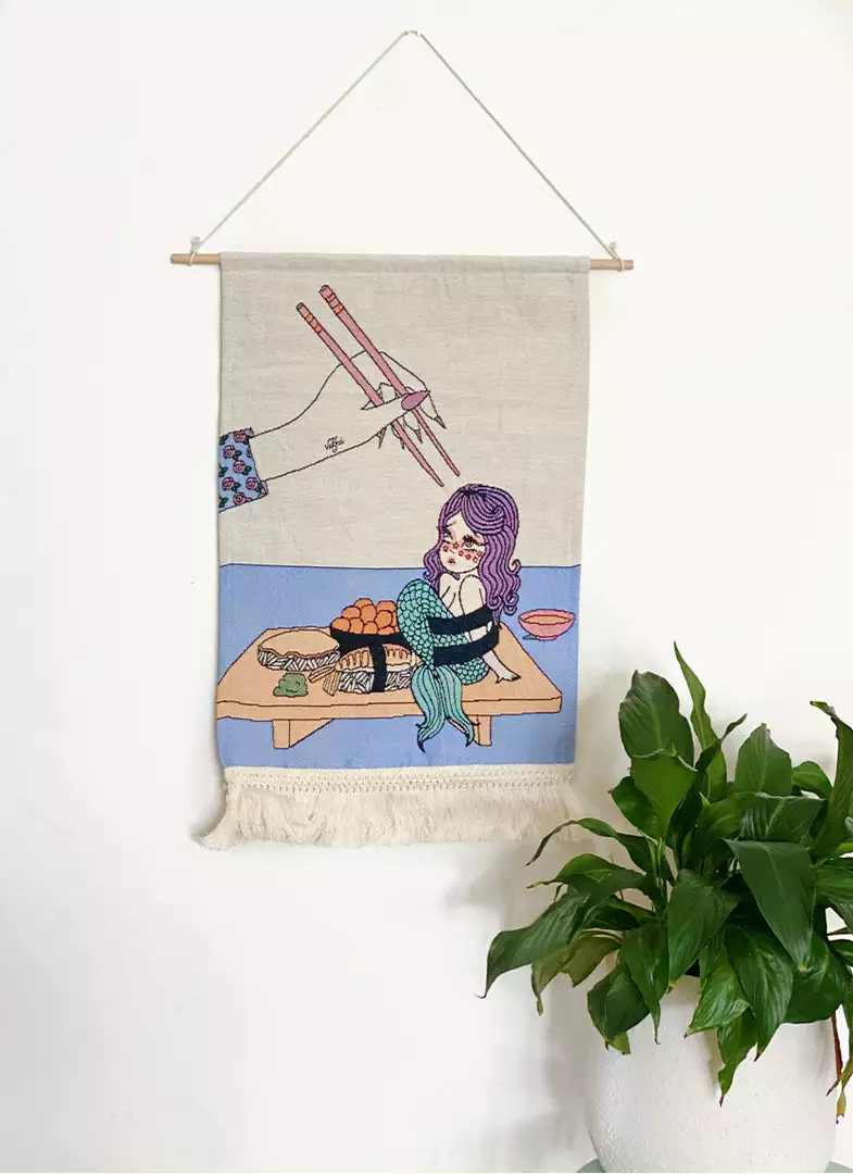 This woven tapestry features original Valfré artwork, a wooden rod to easily hang, and fringe at the bottom.