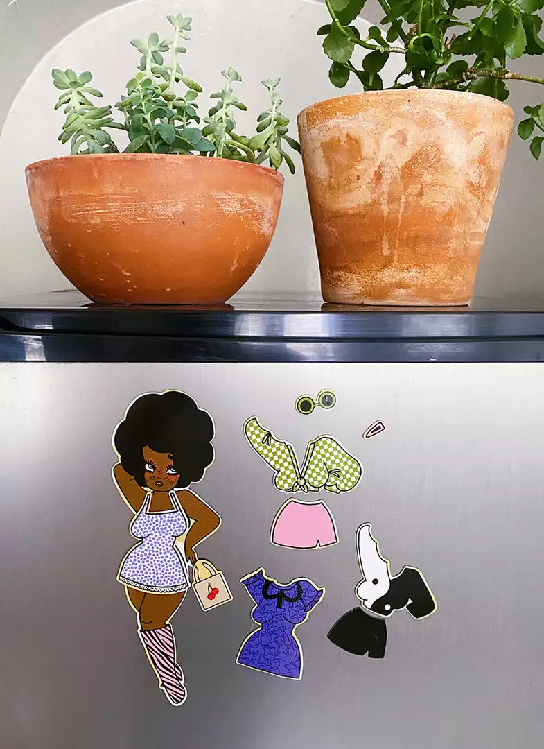 Style your fridge with new Valfré magnetic paper doll’s. Includes 1 Valfré girl and 9 items to dress your doll with. Use a scissors to cut closer to the lines, or make your own design.