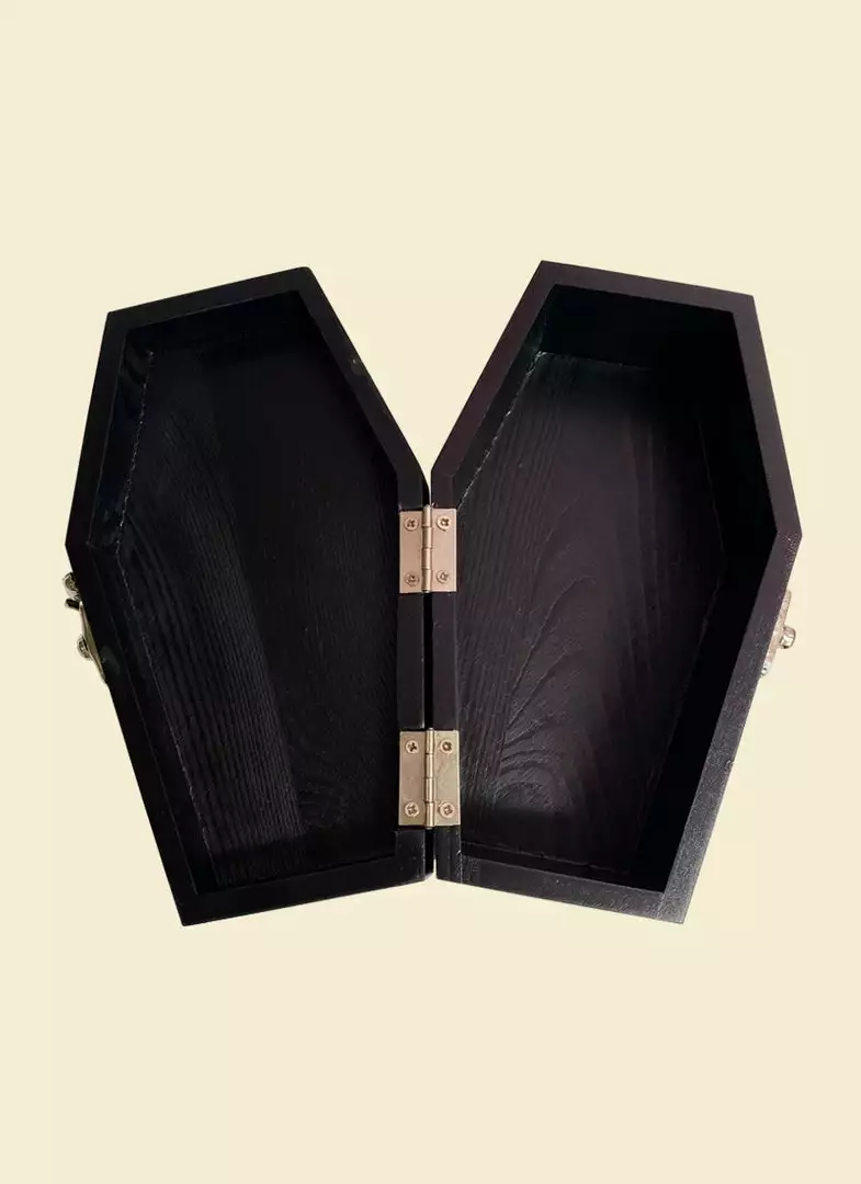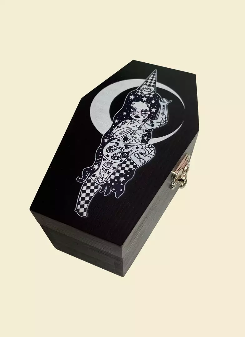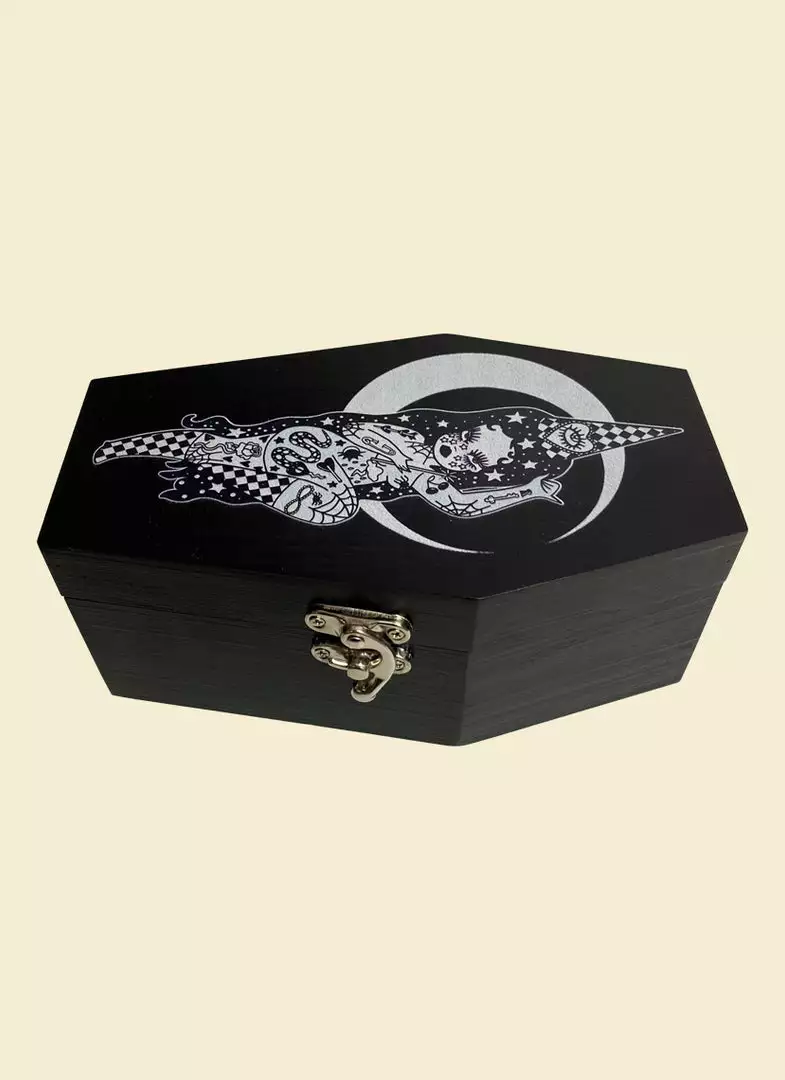 This wooden black stash box features original Valfré Wizard artwork, a latch closure, and compartments inside.
